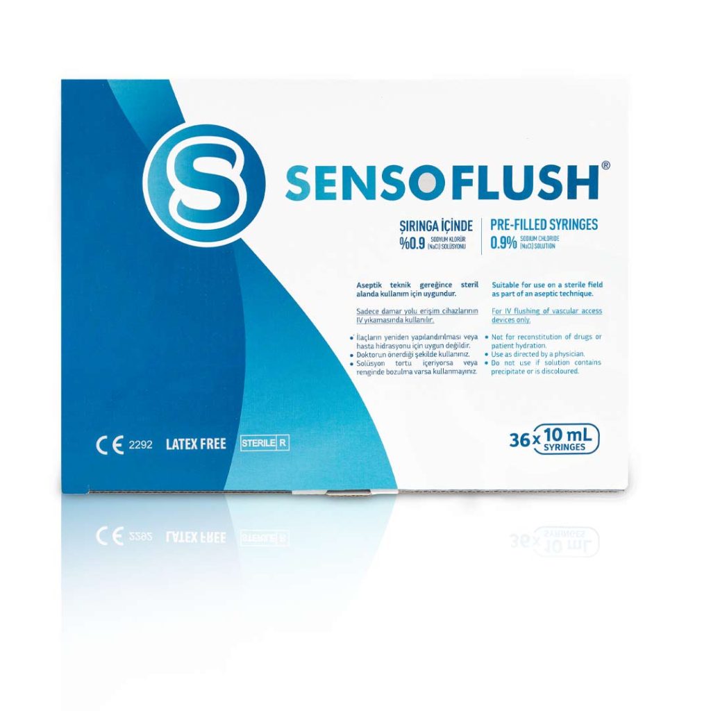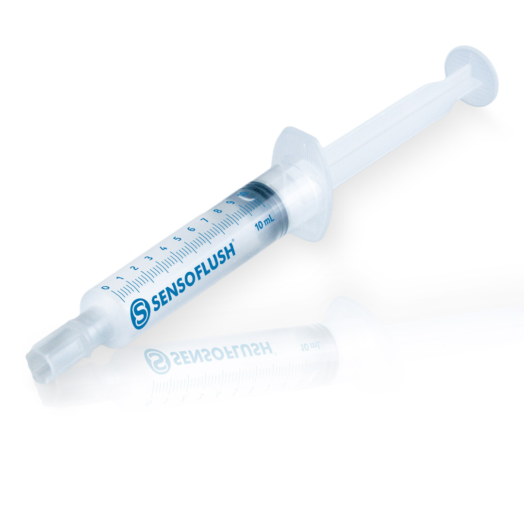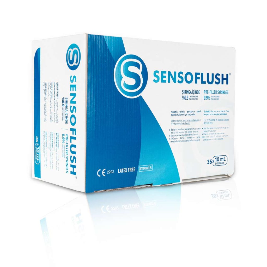 Sensoflush is a sterile, single-use, pre-filled syringe, ready to use, of 0,9% sodium chloride (NaCl) solution. The syringe is made of polypropylene and it has a luer lock.